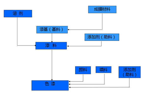 色漆主要是由漆基(基料)和顏料、溶劑所組成。漆基塗料中的不揮發部分,它能形成塗膜,並能粘結顏料。溶劑是一種在通常幹燥條件下可揮發的,並能完全溶解漆基德單一或混合的液體。必要時還用一些添加劑亦稱助劑。色漆的組成按成膜構成中的作用來劃分,可分為揮發分不揮發分兩大部分(見圖1-1)。