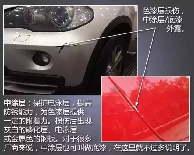 2、中塗層是保護電泳層,提高防鏽的能力,為色漆層提供一定的附著力。損傷後出現灰白的磷化層、電泳層或者金屬色的鋼板。對於很多廠商來說,中塗層也叫做底漆。