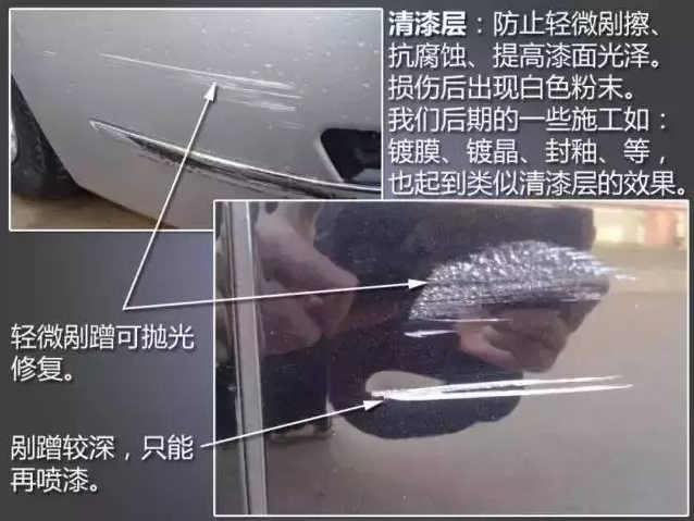 4、清漆層是為了防止輕微刮擦、抗腐蝕,提高漆麵光澤,損傷後出現白色粉末。草莓视频黄色版後期的一些施工如:鍍膜、鍍晶、封釉等也起到類似清漆層的效果。